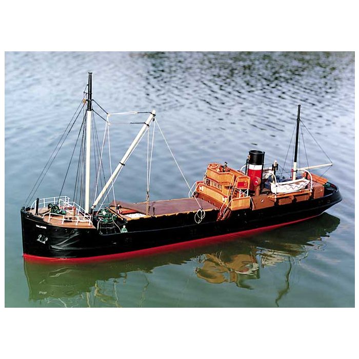 The SS Talacre is a typical single hatch coaster used in the coal trade of a type that was found by the hundreds around the coast of the U.K. in the golden era of steam. Designed for Point of Ayr Collieries by Crichton, Thompson & Co Ltd., of London she was built by Crabtree &Co., of Great Yarmouth in 1917. Talacre was named after a small village near the colliery. Talacre was finally scraped in 1959 by the Hammond Lane Foundry in Dublin. Realism leaps out of the completed model, as if a turn of a valve will start the anchor windlass or the cargo winch clattering away and the lagged steam pipes to begin steaming and drying out. The hull is of GRP fully detailed on the exterior with plating, double riveting and strakes. The whole package is complete with CNC cut plywood, printed overlays, funnel material, hatch cover, moulded ships boats, mast and boom material, cargo material, rigging cord, prop shaft, transfers, detailed drawings and instruction book, crew members and all cast white metal fittings to complete. The Talacre can be fitted with an electric motor and standard Radio Control equipment or built as a superb static display model. The kit has now been updated to include brass stanchions, brass portholes, resin cowl ventilators etc.