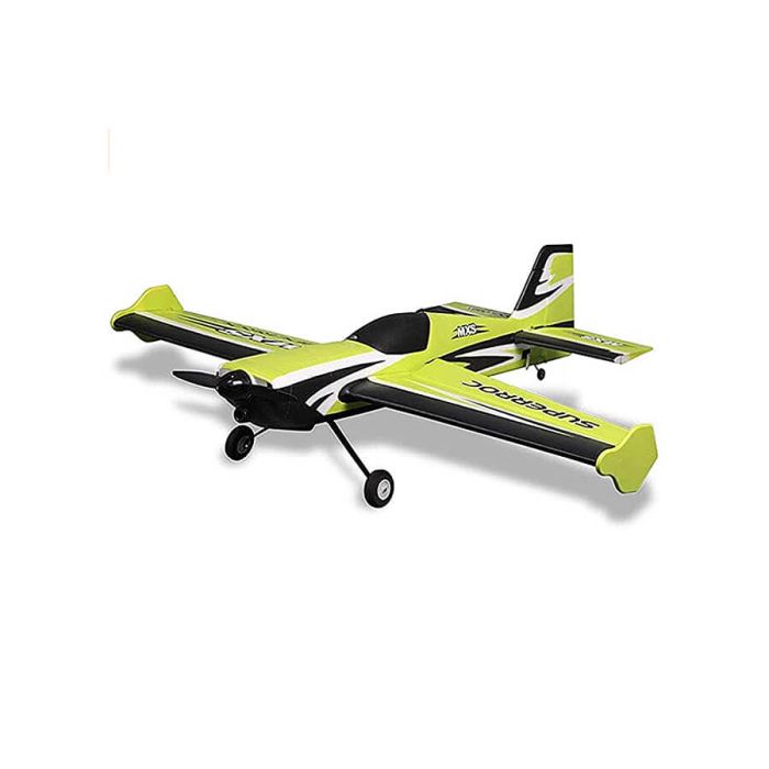 Built from super strong EPO foam, the MXS is glueless, requiring only 10 screws. Add your 4 channel receiver and 3s 2200mAh battery and you are ready to fly. The strong tube spars in the wing and tail create a super rigid structure that can withstand even the harshest 3D punishment. The updated powerful 3541 1230kv Outrunner, 40amp ESC, & 4 full Metal Gear Digital servos are pre-installed. The precision ball links and rods expedite assembly time and provide precise control of nearly any aerobatic manoeuvre desired. Extra long servo arms are designed in an over-center position from the control surface horns to provide massive amounts of control surface throw for low speed Harrier & hovering flight. Wing tip Side Force Generators further enhance the low speed performance by directing the airflow over the ailerons for more positive control. Tough but lightweight aluminium landing gear with large 2 1/2” wheels make grass take-offs and landings a breeze. A large, magnetic hatch makes changing the battery quick and easy task! Painted in bright green and black, the new version 2 MXS is sure to get plenty of attention at the flying field!