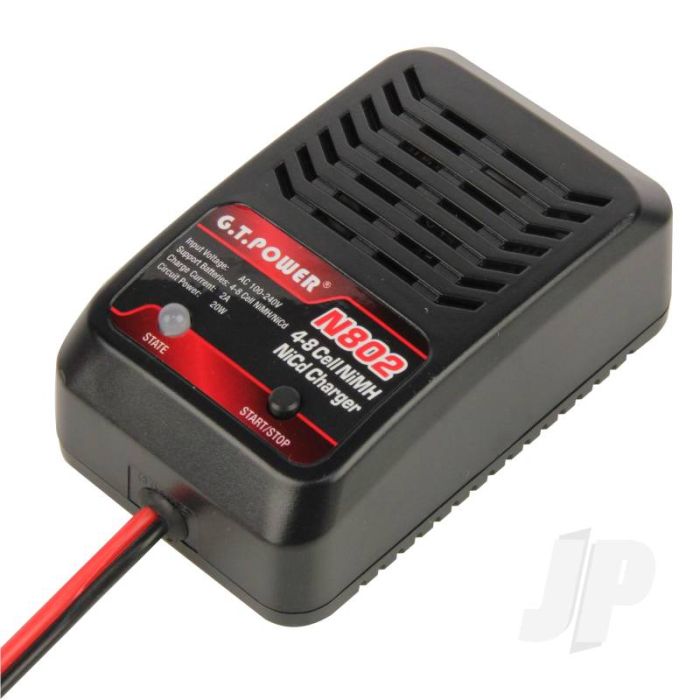 The N802 charger is a simple, capable and safe NiMH peak detection charger in a compact package. With its foolproof 'plug and charge' interface you just connect your battery and press the button, whereupon the charger automatically selects the appropriate charge current. Supporting 4 - 8 cells at up to 2 amps on AC power, it gets you going again with a minimal wait. Sleek and compact in design this neat unit will also help to keep your workspace uncluttered. Very few chargers combine the simplicity of AC input, a 2 amp capability, and the safety of peak detection charging for NiMH batteries, with such style and affordability.
