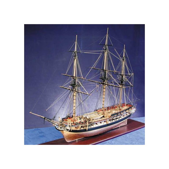 CNC cut timber throughout; brass 18 and 9 pounder cannons; double plank on bulkhead construction; black and natural hemp for rigging; 2,300 1:64 scale copper plates; full size plans; comprehensive instruction manual and drawings. Specification: