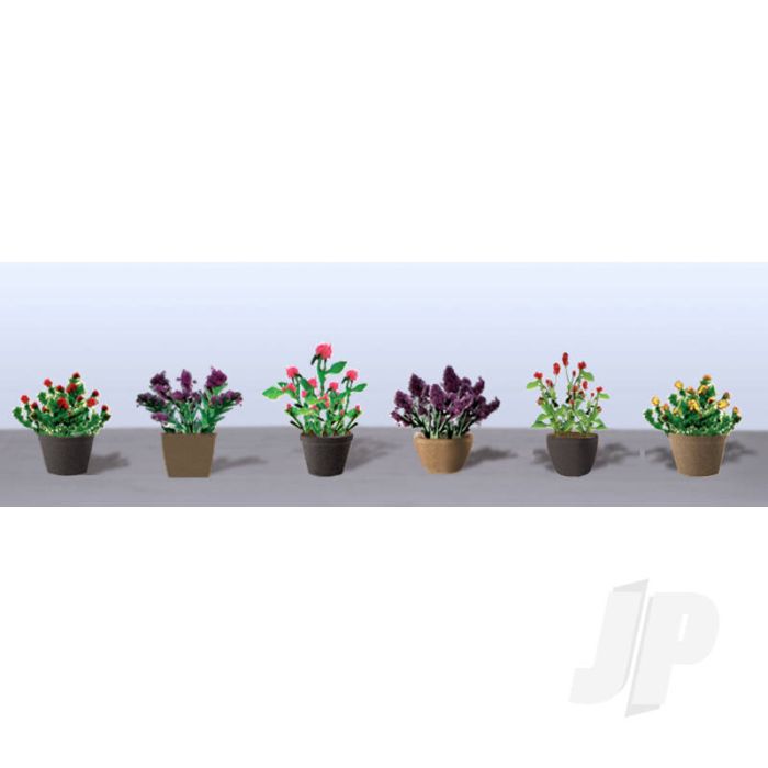Varied colour pots, including some that mimic clay, hold brightly hued flower plants. Have a dollhouse? Put a few pots in or outside the windows. Planting a garden? Form a perimeter with these decorative pots. Landscaping a city or rural layout? They highlight any scene.The plant in each flower pot nicely complements the shape and colour of the container. Made in HO-scale, 5/8", 6/pk.