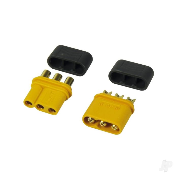 #1-02291 MPX connector MR30 The MPX MR-30 plugs are constructed asymmetrically, which guarantees high protection against polarity reversal. They are suitable as a plug connection between controller and motor for small brushless drives or as a connector for wing/tail servos on the fuselage. The housing made of temperature-resistant polyamide is classified according to fire class UL94 V0. High-quality, gold-coated brass contacts transmit high currents with low resistance and reliable contact. The soldering connections of the MR30 contacts are designed for cables with a cross-section of up to approx. 0.8-1.0mm (AWG 18/17).More Information