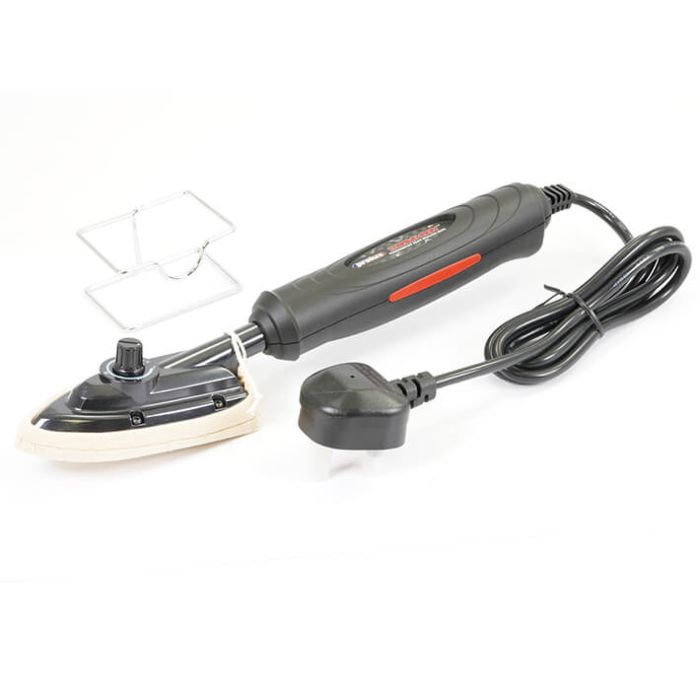 Essential for application of model covering films such as Solarfilm and perfect for any heat shrink or fabric covering. New design shape makes fillets and compound curves a cinch. This heat iron offers precise temperature control up to 205°C with minimal temperature drift and comes complete with Teflon coated shoe, safety holding stand and hot shoe sock for ultra smooth finish.